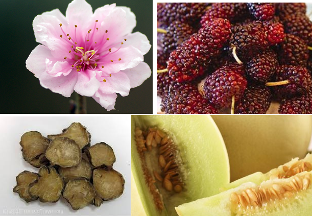 – Bài Đào hoa hoàn (Thái bình thánh huệ phương): đào hoa 105g, hắc phụ tử 35g, bạch phụ tử 35g, hạnh nhân 35g, quế tâm 70g, cam thảo 35g, điềm qua tử nhân (hạt dưa bở) 35g, quả dâu chín sao 35g. Các vị tán bột luyện với mật làm viên to bằng hạt ngô đồng, mỗi lần uống 10 viên với rượu hâm nóng, ngày 3 lần, chữa các vết nám trên mặt rất hiệu nghiệm.
