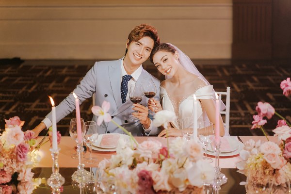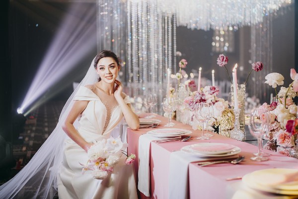 Không gian nơi hai người mẫu chụp ảnh được trang hoàng bằng hoa tươi, đèn chùm, những dây pha lê lấp lánh khiến hình ảnh "cô dâu, chú rể" thêm lung linh, lãng mạn.