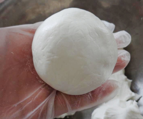 Từ từ đổ bột từng ít một vào âu trộn cho khỏi bị vón cục, trộn đến khi bột tan hết vào nước. bạn cũng không nên trộn quá lâu bởi bánh sẽ bị chai cứng. Dùng màng bọc thực phẩm bọc kín để bột nghỉ 30 phút rồi nặn bánh.