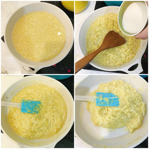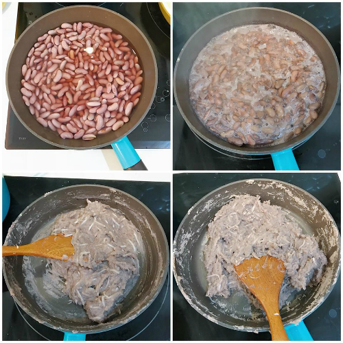 Đậu xanh sau khi ngâm, vớt ra đun với nước cho mềm. Sau đó, cho đường và dừa tươi vào, đảo trên lửa nhỏ để nước bay, đến khi đậu xanh thành một khối có thể vo tròn không dính tay là được.
