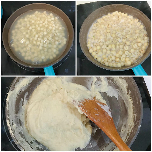 Nhân hạt sen: 200g hạt sen (ngâm nước lã qua đêm), 80g đường cát, 1 nhúm muối nhỏ.