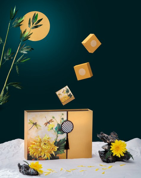 Lấy cảm hứng từ khu vườn tĩnh lặng với nền cát trắng, hòn non bộ và khóm cúc vàng, khung cảnh hiện lên sống động. Bức tranh trở nên rực rỡ hơn với khung cảnh trời đêm trăng sáng, cành trúc la đà và đôi chuồn chuồn đuổi bắt nhau.