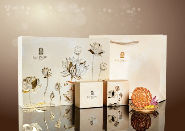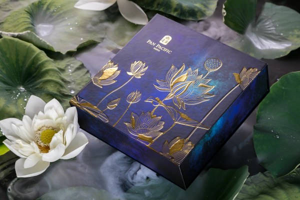 Lấy cảm hứng từ hồ Tây thơ mộng, hộp bánh trung thu Pan Pacific Hà Nội là món quà sang trọng với hai sắc điệu hòa quyện, gợi đến hình ảnh sen nở trong đêm và cánh hoa đan vào ánh trăng từ ý thơ xưa.