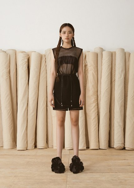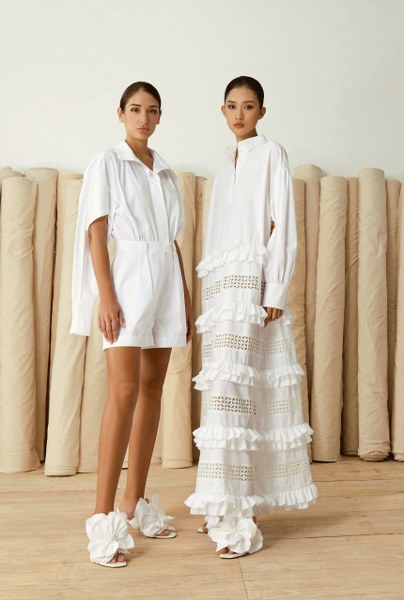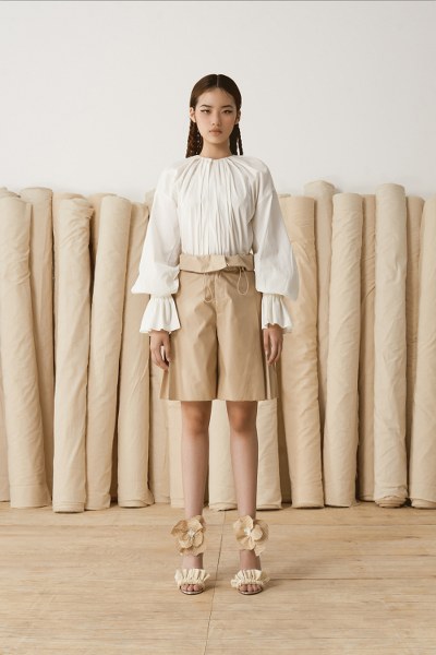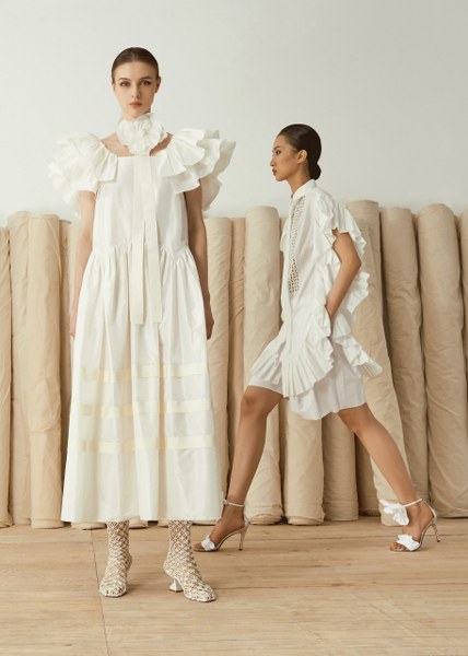 Nhà mốt tiết chế các họa tiết để tập trung hướng đến tinh thần tối giản. Dù vậy, trang phục không hề đơn điệu nhờ những chi tiết xẻ vai, những cánh tay áo được thổi phồng và xếp bèo, uốn lượn nhẹ nhàng như những cánh hoa xòe đang ở độ còn e ấp gợi mở nhiều mong đợi.