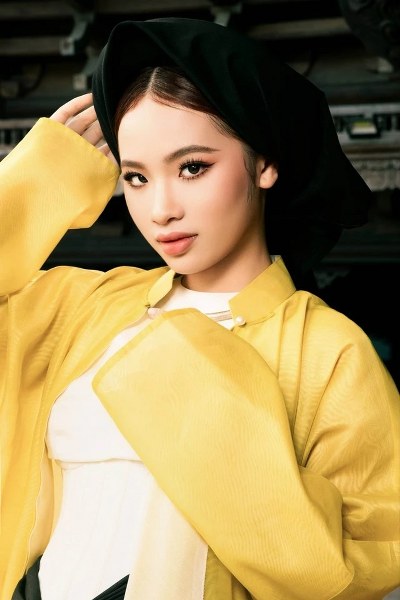Trang phục áo dài được người mẫu 14 tuổi kết hợp cùng kiểu tóc tết tinh nghịch và đáng yêu.