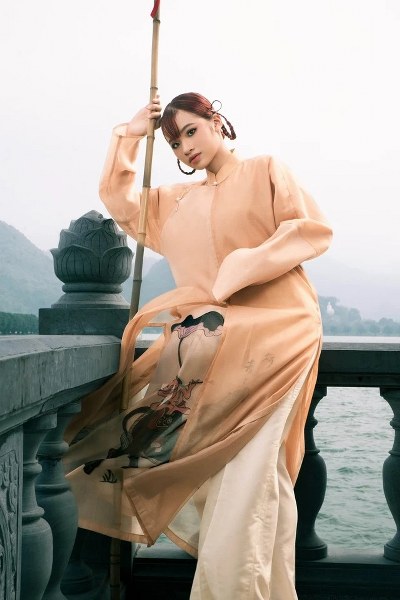 Áo dài xưa được nhà thiết kế trẻ sáng tạo, cải biến qua những chi tiết lớp lang và phom dáng hiện đại đi cùng họa tiết là bức tranh Đông Hồ nổi tiếng Mục đồng chăn trâu thổi sáo.