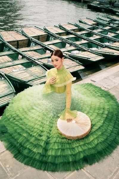 Ở mẫu thiết kế lấy cảm hứng từ những chiếc lá sen, Bảo Hà chọn khung cảnh hồ nước rộng mênh mông để thả dáng quyến rũ.