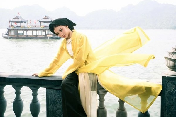 Thiết kế thể hiện kỹ thuật chuyển màu tinh tế cùng phom dáng hiện đại, trẻ trung. Nàng mẫu 14 tuổi lựa chọn thần thái tươi tắn rạng rỡ cùng những kiểu pose dáng nhẹ nhàng, đơn giản phù với khung cảnh nên thơ của ngôi chùa nổi tiếng.