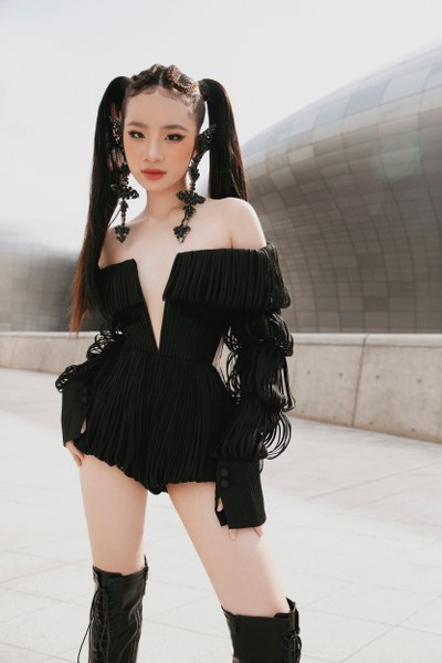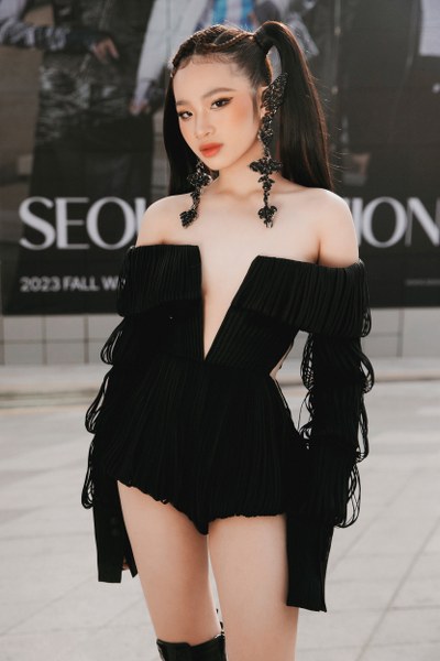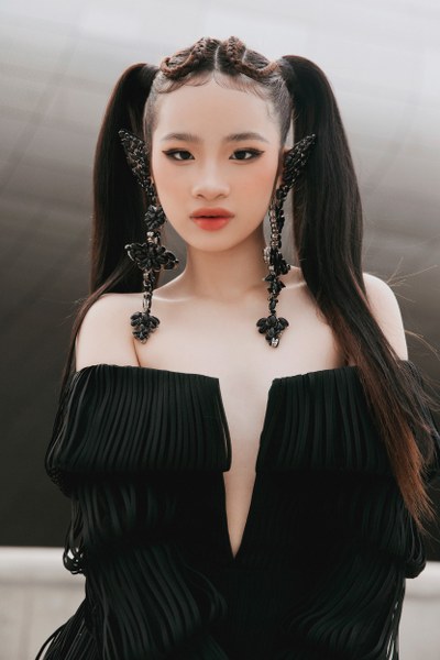 Phần ngực của bộ trang phục được cắt xẻ táo bạo, giúp Bảo Hà khoe trọn bờ vai thon. Mẫu nhí kết hợp cùng hoa tai to bản, đôi boots da cá tính và kiểu tóc buộc hai bên, tạo nên một tổng thể hài hòa thu hút sự chú ý của truyền thông quốc tế.