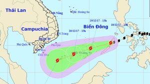 Trong 24 giờ tới, bão di chuyển theo hướng Tây Tây Nam, mỗi giờ đi được khoảng 15km. Đến 13h ngày 19/12, vị trí tâm bão ở vào khoảng 9,5 độ Vĩ Bắc; 115,3 độ Kinh Đông, cách đảo Song Tử Tây (thuộc quần đảo Trường Sa) khoảng 220km về phía Nam Đông Nam. Sức gió mạnh nhất ở vùng gần tâm bão mạnh cấp 8 (60-75km/giờ), giật cấp 10.