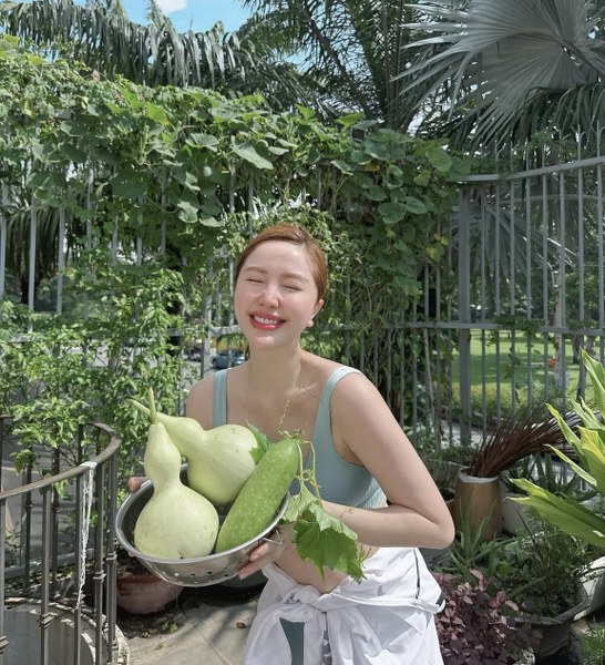 Ca sĩ Bảo Thy thường xuyên chia sẻ khoảnh khắc thu hoạch rau xanh, hoa trái ở vườn nhà. Cô đang sống cùng chồng và con trai trong biệt thự rộng 400m2 tại TPHCM.