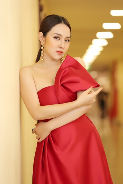 Bảo Trâm đẹp lộng lẫy trong sắc đỏ quyến rũ, thiết kế cúp ngực tôn trọn vẻ gợi cảm của nữ ca sĩ.