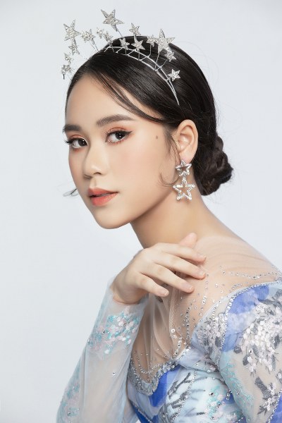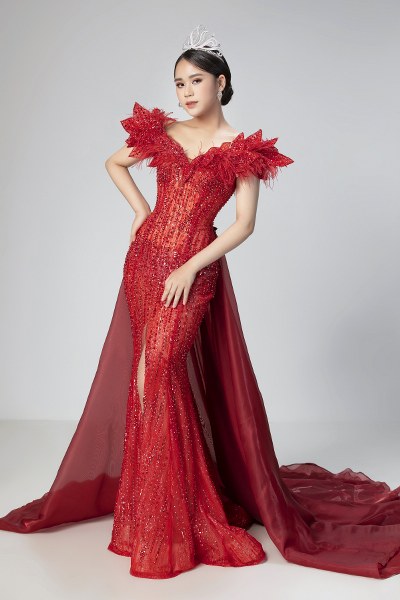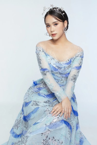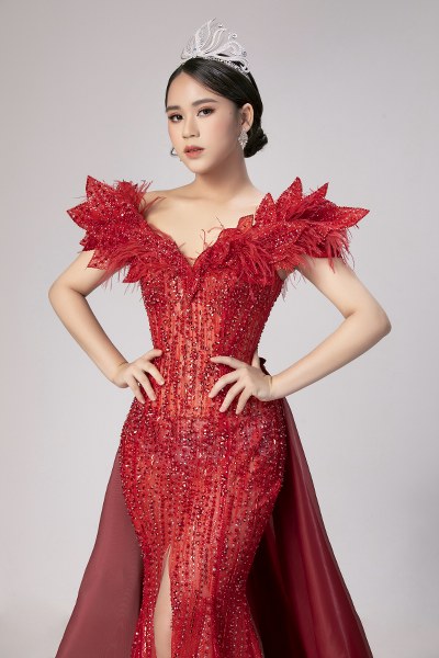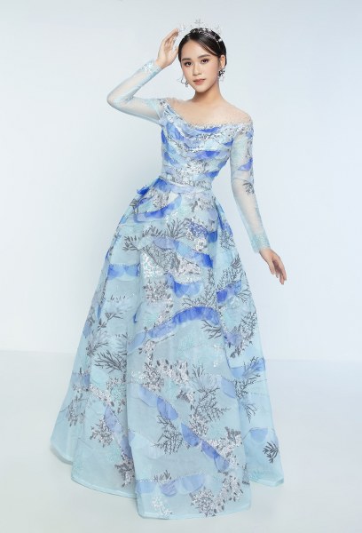 Miss Eco Teen International Bella Vũ Huyền Diệu tôn nhan sắc khả ái, hình thể cân đối với các mẫu váy dạ hội của nhà thiết kế Nguyễn Minh Tuấn.