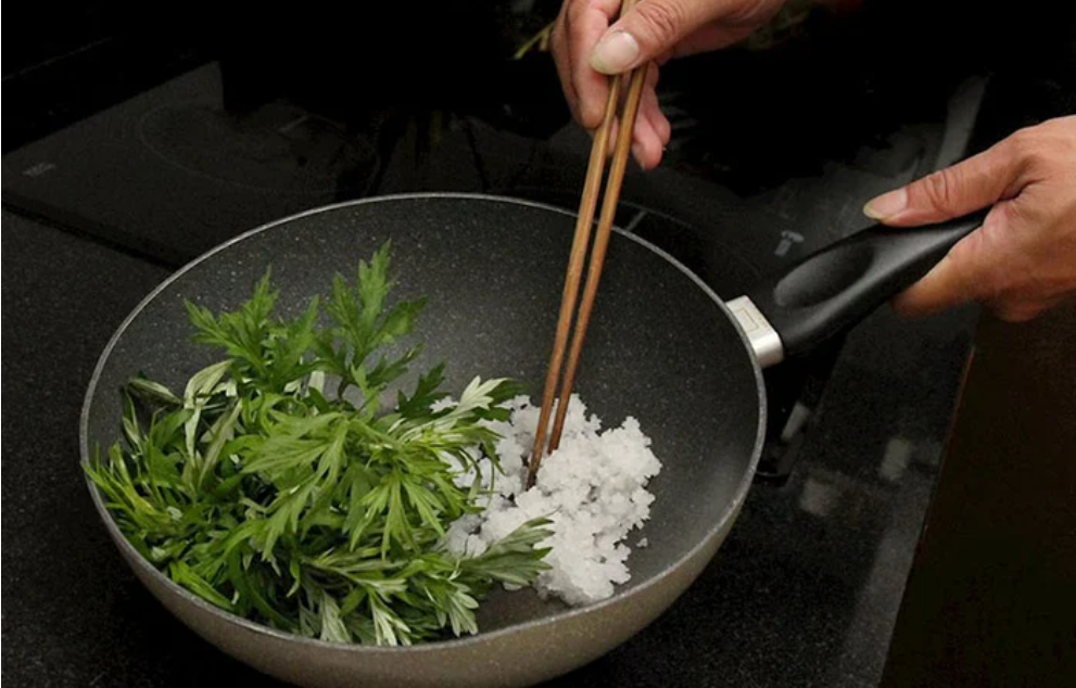 – Lấy 1 nắm rau ngải cứu rửa sạch và phơi cho ráo nước. Sau đó, cho ngải cứu lên bếp rang cho tới khi lá chuyển sang màu thẫm thì bạn cho thêm 0,5kg muối hột vào rang tiếp.