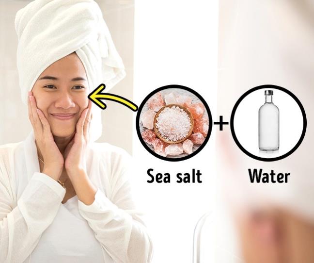 Thêm 1 muỗng muối biển vào ly nước ấm và khuấy đều. Sau mỗi lần rửa mặt, dùng bông tẩy trang nhúng vào dung dịch trên và lau lại trên da.