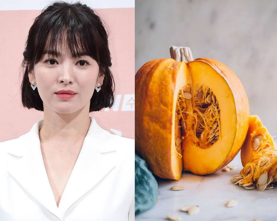 Vóc dáng thon gọn cùng làn da căng mướt, soi cận cũng khó thấy lỗ chân lông của Song Hye Kyo đã được đông đảo dân tình công nhận. Và góp phần không nhỏ làm nên sắc vóc đáng ngưỡng mộ ấy chính là thực đơn ăn uống nhiều rau củ quả tươi; trong đó, bí ngô là thực phẩm được Song Hye Kyo tin tưởng dùng cho những lúc da nổi mẩn, sưng phù. Tuy nhiên, ngay cả khi không gặp những vấn đề về da, bạn vẫn nên bổ sung bí ngô vào chế độ ăn vì loại rau quả này rất giàu vitamin C, giúp chống lão hóa, cải thiện đốm nâu, nếp nhăn…