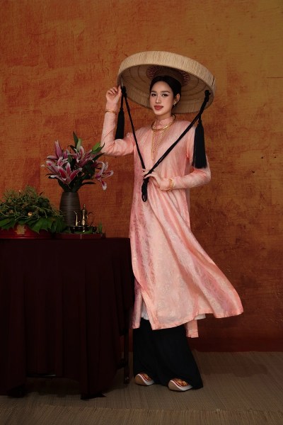 Hoa hậu Việt Nam kết hợp áo với quần lụa đen và hài, đeo kiềng vàng. Phụ nữ Bắc Bộ xưa trong những gia đình giàu có thương mang loại giày này - thiết kế chịu ảnh hưởng của trang phục triều Nguyễn.