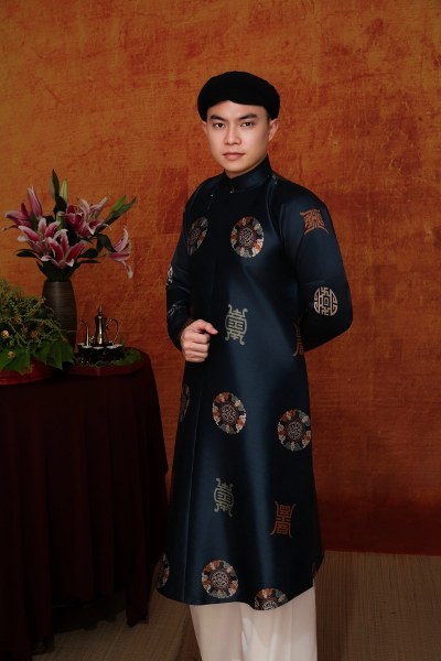 Doanh nhân Viết Vương đội khăn xếp, diện áo dài mang các biểu tượng của trường thọ, may mắn, bưng đĩa đựng trà và trầu cau.