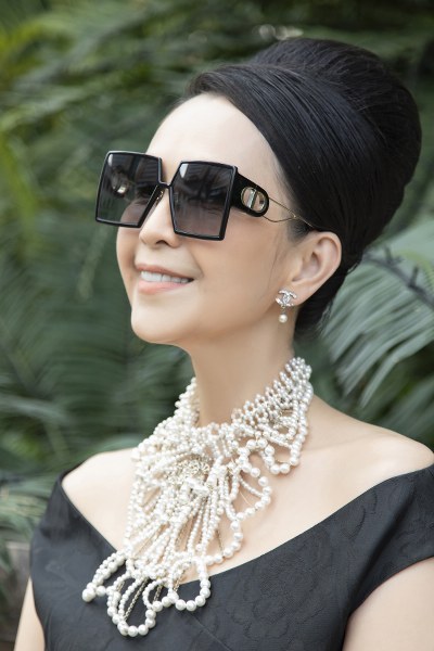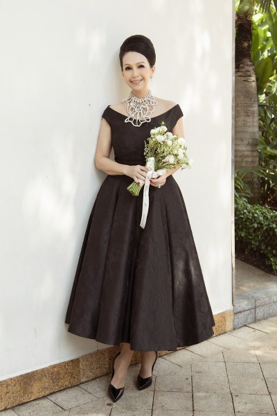 Nữ diễn viên diện bộ váy đen may bằng vải gấm, phom dáng cổ điển, thanh lịch. Đây là trang phục do nhà thiết kế Đỗ Mạnh Cường thực hiện riêng cho Diễm My. Ngôi sao thập niên 1990 khéo phối hợp phụ kiện vòng cổ ngọc trai, bông tai, giày hàng hiệu, tôn vẻ sang trọng, quý phái.