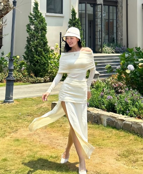Khánh Linh toát lên vẻ nhẹ nhàng với váy trễ vai xẻ đùi, kết hợp giày búp bê.