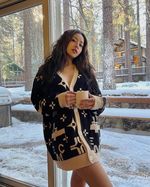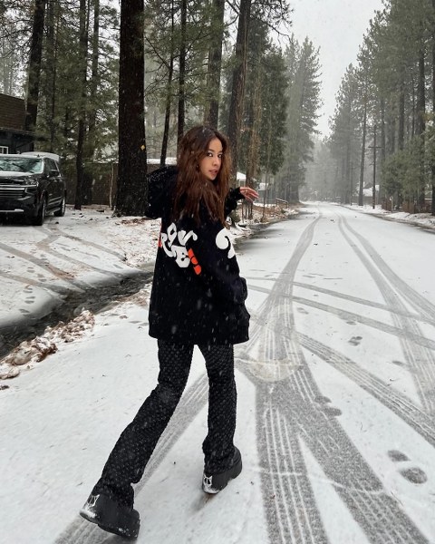 Các bộ đồ bằng len bó sát và giày Ugg lót lông bên trong cũng được cô yêu thích vì giữ ấm tốt. Người đẹp thể hiện phong cách Y2K với bộ đồ màu kem, nhấn bằng áo khoác lông và bao chân đồng điệu, túi Gucci.
