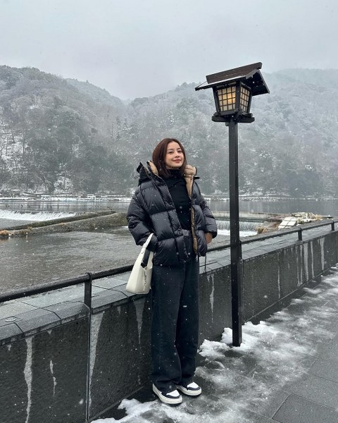 Bộ cánh dạo chơi ở Kyoto với sneakers, quần jeans, áo khoác phao và túi Saint Laurent trắng.