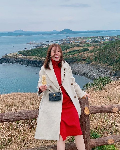 Trong một lần đến đảo Jeju, Hàn Quốc, người đẹp chọn thiết kế tối giản phom rộng tạo sự thoải mái, gồm đầm len đỏ và áo khoác len dáng dài, kết hợp túi Chanel.