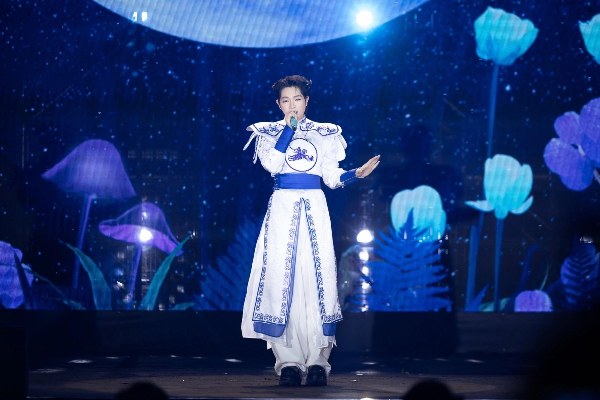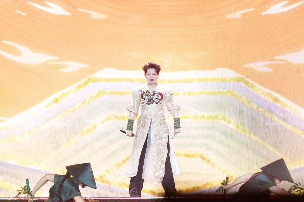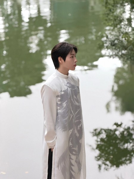 Trên nhiều sân khấu, Đức Phúc chọn áo dài khi biểu diễn "Phù Đổng Thiên Vương" - ca khúc từng giúp anh chiến thắng cuộc thi âm nhạc quốc tế. Nhạc phẩm do Hồ Hoài Anh sáng tác, một phần lấy cảm hứng từ truyền thuyết Thánh Gióng cưỡi ngựa bay về trời.