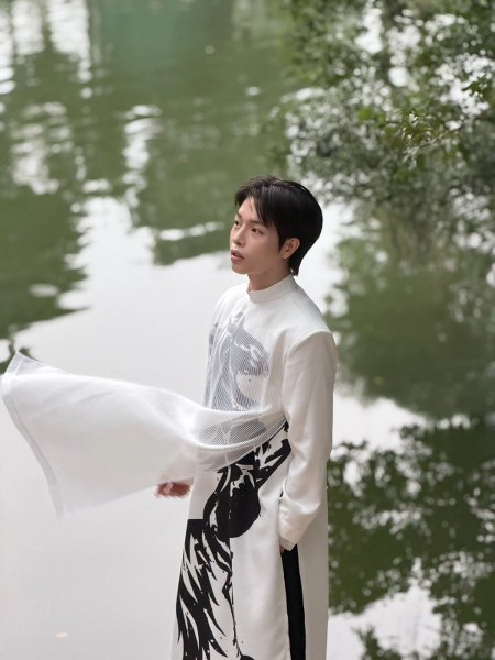 Đức Phúc tạo dáng với áo dài hình ảnh ngựa in trên tà, phủ ngoài là một lớp lưới.