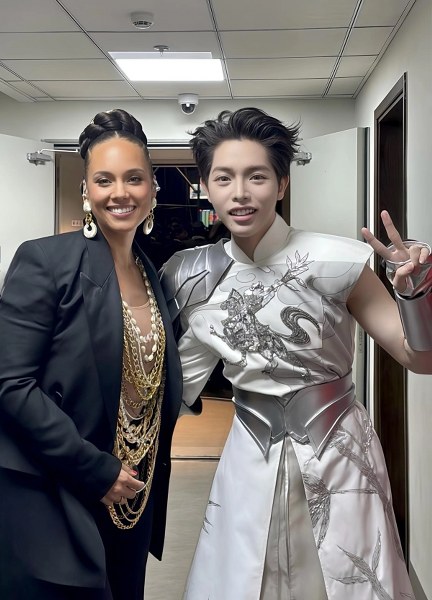 Đức Phúc mặc trang phục tôn vinh văn hóa Việt chụp ảnh cùng ngôi sao Alicia Keys tại hậu trường sự kiện hồi tháng 12/2025 ở Hà Nội.