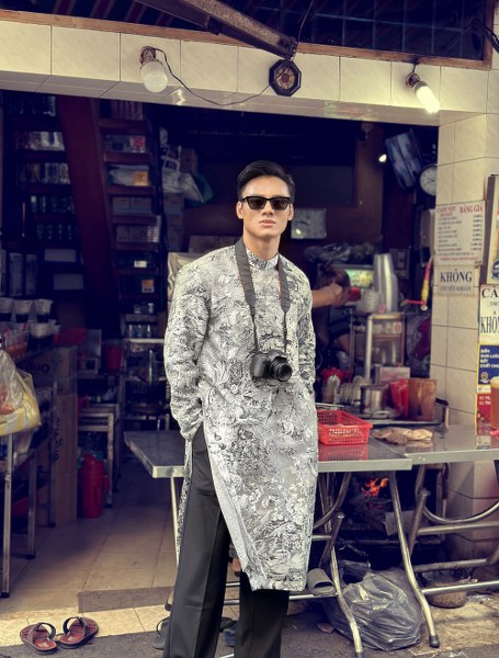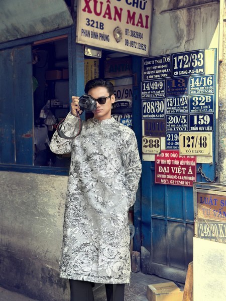 Minh Khắc chọn thiết kế vừa truyền thống vừa hiện đại với các họa tiết hoa to bản mang sắc xám chủ đạo. Nam vương cầm máy ảnh, đeo kính đen tham quan các khu chợ, cửa hàng bình dân và khám phá các chung cư lâu đời ở Sài Gòn.