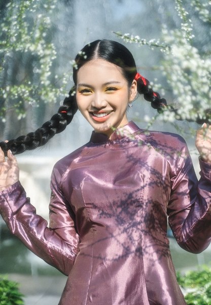Nữ ca sĩ sinh năm 2002 diện áo dài tông hồng phom cổ điển, ống tay suông, tà dài chấm gót, kết hợp cùng chất liệu tơ óng organza cùng thiết kế chiết eo, giúp cô nàng khoe khéo vóc dáng chuẩn.