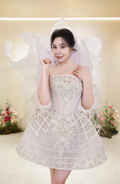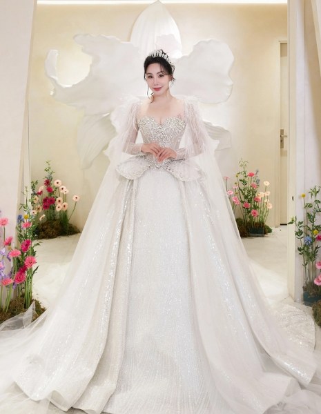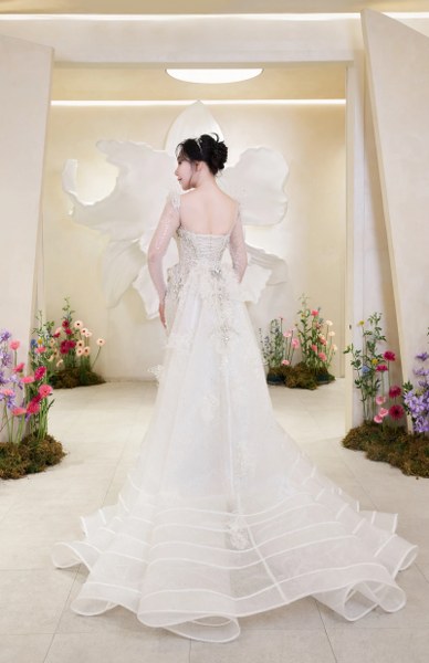 Khi lên lễ đường, ca sĩ diện đầm công chúa với thân trên dáng peplum, thân váy đính sequin và 10.000 viên pha lê swarovski tạo hiệu ứng bắt sáng. Phần ống tay làm từ vải tulle xuyên thấu, đính lông vũ thể hiện nét vương giả. Cô dâu đội khăn voan thêu tên riêng - món quà Linh Nga dành cho cô như một lời chúc phúc cho chuyện tình viên mãn.