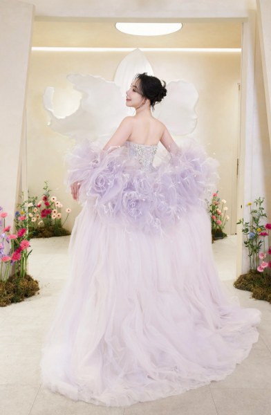Hồ Quỳnh Hương cho biết cô thích màu tím nên chọn bộ váy ngắn màu này trong buổi tiệc sau đám cưới. Dáng váy quây ngắn trên gối tạo nên vẻ ngoài trẻ trung. Tuy vậy, cô không kịp thay bộ váy này ở tiệc cưới.