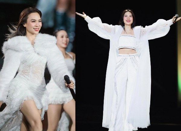 Mỹ Tâm diện váy ren xuyên thấu kết hợp áo blazer bằng lông trong show "See The Light" hồi tháng 12/2025 (trái). Trong show đón năm mới 2026, ca sĩ chọn crop-top phối quần ống loe tông trắng khoe eo thon. Hai mẫu trang phục đều là tông màu yêu thích của cô.