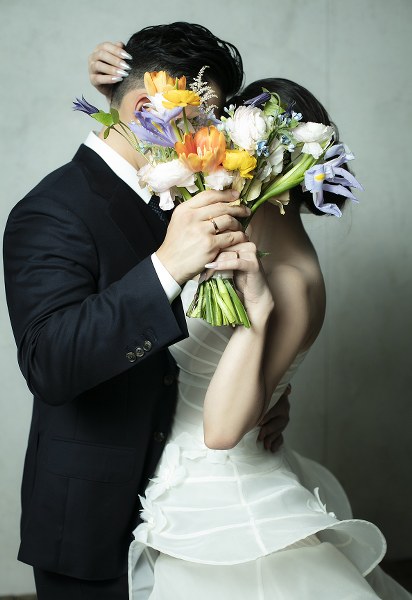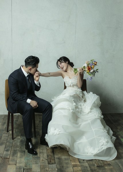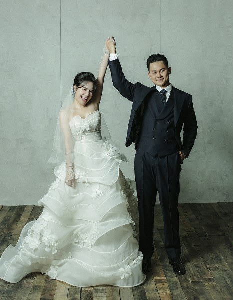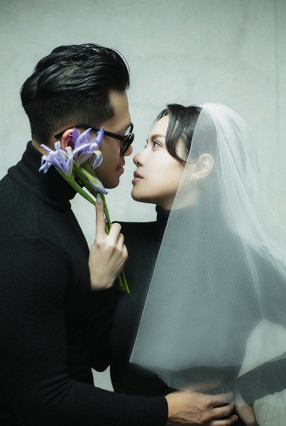 Cô cho biết bạn đời không quen với việc chụp ảnh nhiều giờ liền nên chọn không gian studio nhẹ nhàng, để anh thấy thoải mái nhất có thể.