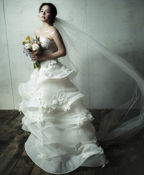 Ca sĩ diện váy cưới của nhà thiết kế Quỳnh Anh với phom dáng xếp tầng, đính hoa vải.
