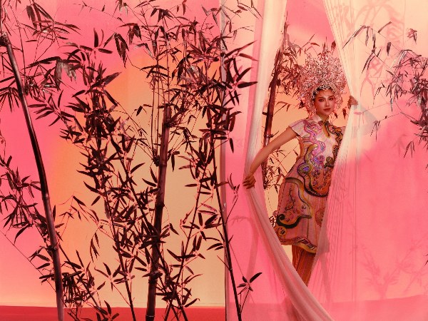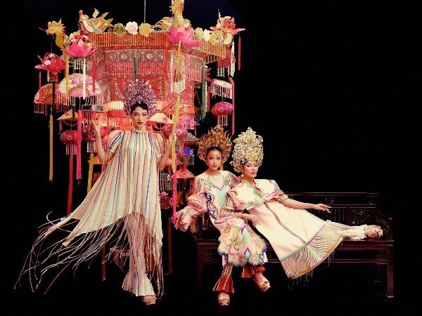 Họ diện trang phục thuộc bộ sưu tập Ru - Hò xự xang xê cống của nhà thiết kế Thủy Nguyễn.