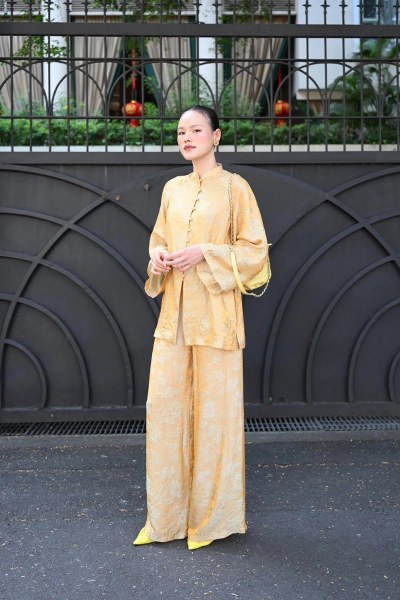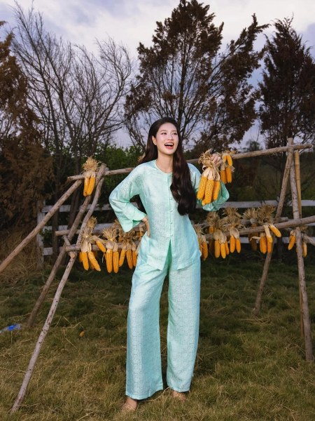 Hòa theo xu hướng còn có Hoa hậu Phương Khánh. Để tạo khác biệt, cô phối áo xanh cùng quần lụa vàng thay vì diện cả bộ đồng màu.