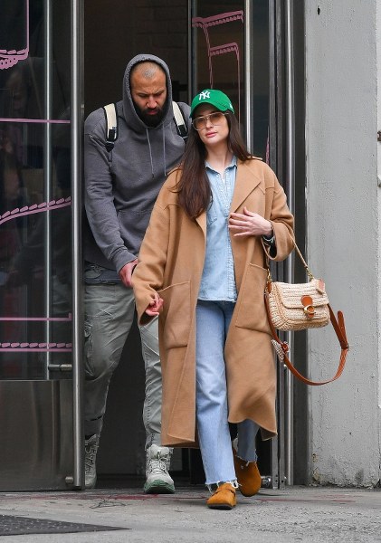 Ca sĩ Kacey Musgraves xuống phố với tông nâu chủ đạo, gồm áo khoác dạ, túi đan móc, phối bộ denim.