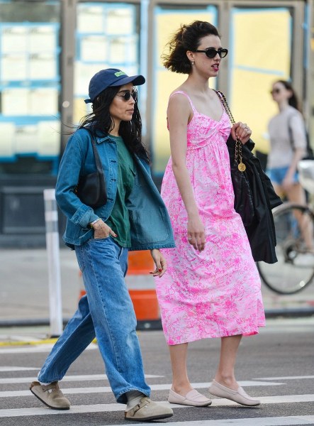 Diễn viên Zoë Kravitz (trái) diện cả bộ denim và dép sục khi dạo phố cùng Margaret Qualley.