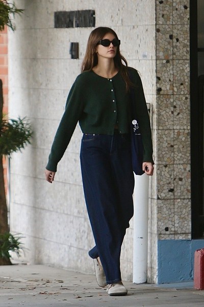 Người mẫu Kaia Gerber xây dựng cách mặc chuẩn Mỹ với cardigan, quần jeans và dép sục.