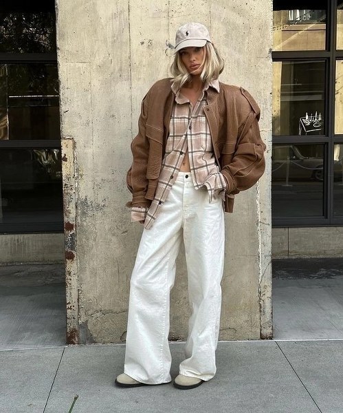 Người mẫu Elsa Hosk chọn đôi màu cát, kết hợp áo khoác da, sơ mi kẻ theo kiểu grunge của thập niên 1990.