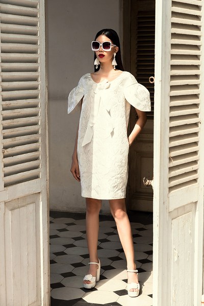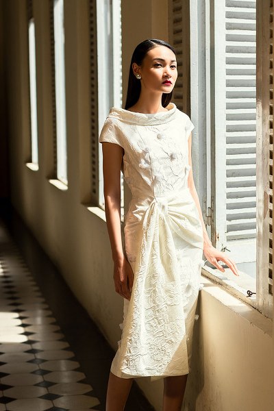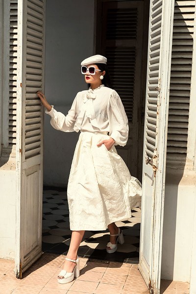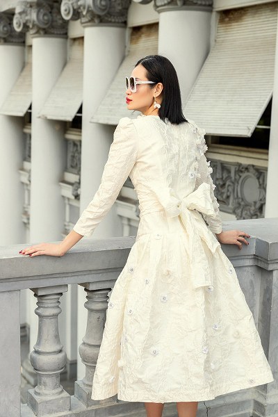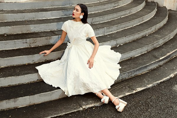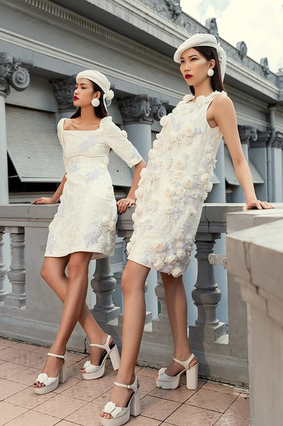 Năm người mẫu đua vẻ thanh lịch bên bậc thềm Bảo tàng TP HCM. Bộ ảnh do chuyên gia trang điểm Tùng Châu hỗ trợ thực hiện