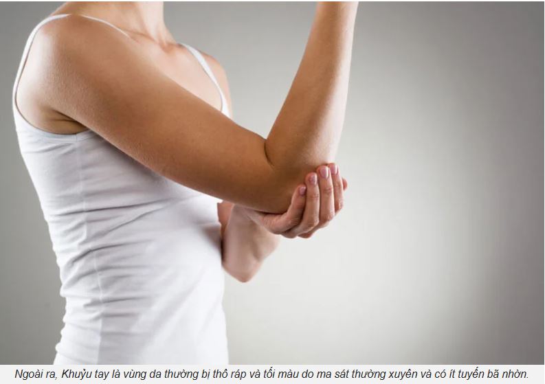 Ngoài ra, Khuỷu tay là vùng da thường bị thô ráp và tối màu do ma sát thường xuyên và có ít tuyến bã nhờn. Nếu không được chăm sóc, vùng da này có thể trở nên chai sần và lộ rõ dấu hiệu lão hóa.