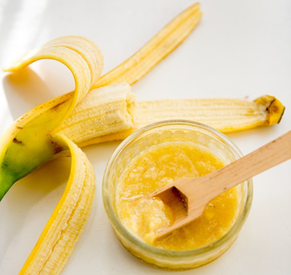 Hai quả chuối chín, một muỗng canh dầu ô liu, một muỗng canh dầu dừa; một ít mật ong trộn đều và nghiền nát. Thoa hỗn hợp này lên tóc của bạn và để khoảng năm phút. Sau đó gội sạch với nước ấm.