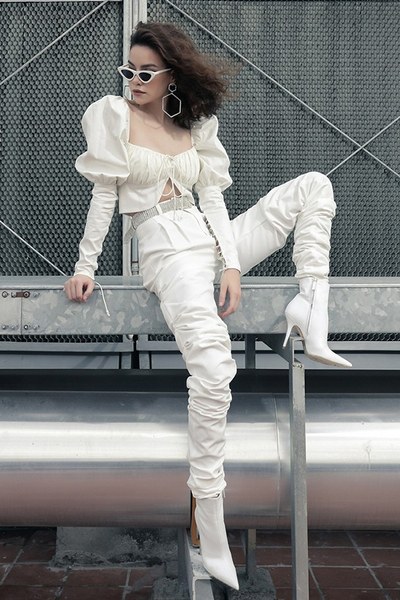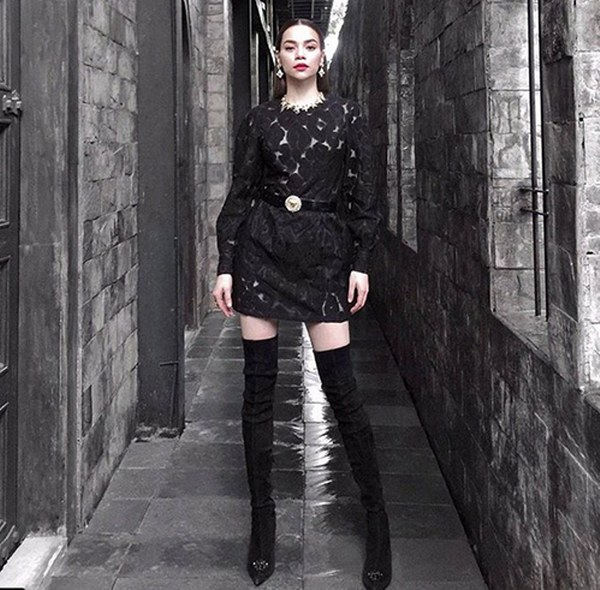Dù diện trang phục theo ‘trường phái’ nữ tính hay cá tính, bốt cao gót tông đen luôn được Hồ Ngọc Hà mix-match hợp lý.
