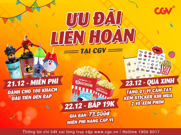 Trong dịp khai trương các rạp chiếu mới, khách hàng ghé thăm CGV sẽ nhận được rất nhiều ưu đãi hấp dẫn. Từ ngày 21/12/2018, 100 khách hàng đầu tiên khi đến mua vé sẽ được tặng một ly nhân vật theo phim như Doraemon, Gia đình siêu nhân, Khách sạn huyền bí… Với hai vé xem phim trên tay, người xem sẽ có cơ hội sở hữu các quà tặng xinh xắn như ví cầm tay và sticker. Ngoài ra, khách hàng còn nhận được ưu đãi bỏng ngô với giá "sập sàn" chỉ 19.000 đồng.