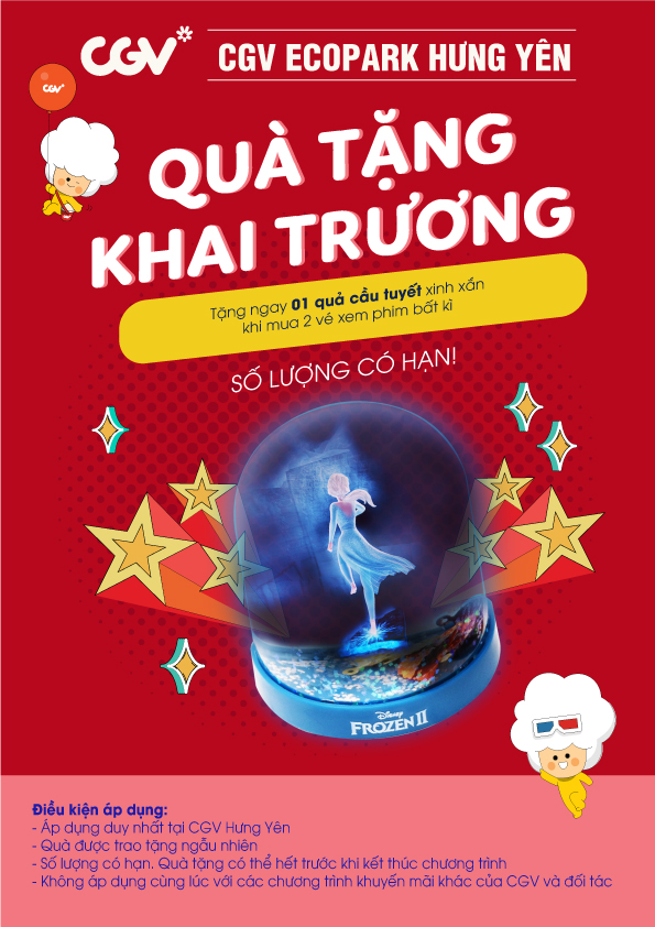 Nhân dịp khai trương, từ 22 – 30/1/2020, khách hàng ghé thăm CGV Ecopark Hưng Yên và mua 2 vé xem phim sẽ được tặng quả cầu tuyết xinh xắn. Đặc biệt trong ngày 22/1/2020, các khán giả nhí sẽ có cơ hội xem bộ phim hoạt hình "Hài Đỏ Và 7 Chú Lùn" hoàn toàn miễn phí.