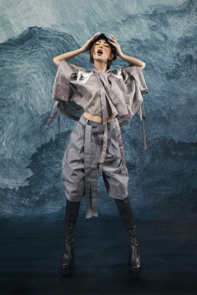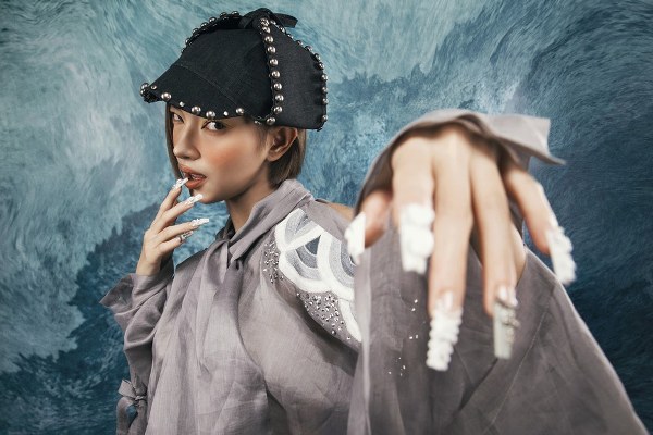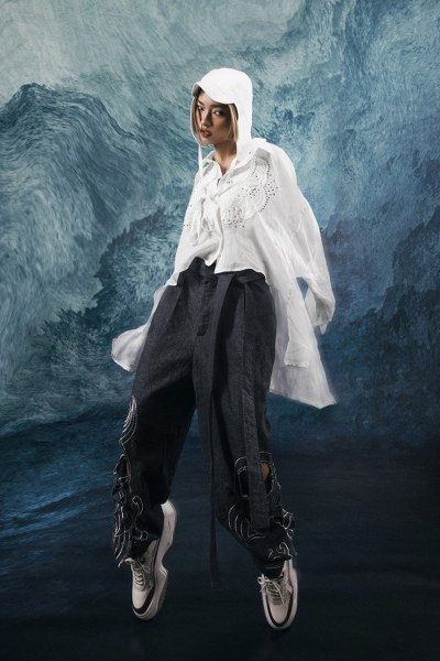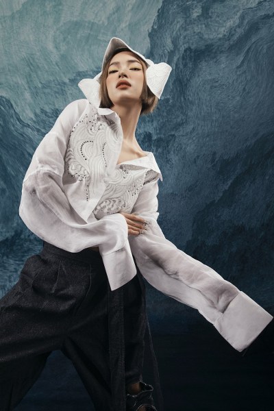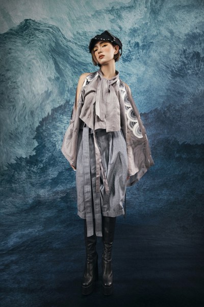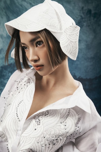 Nhà thiết kế áp dụng nhiều kỹ thuật thủ công xen lẫn hiện đại. Trên nền vải, anh thêu thủ công hoa văn thủy ba cách điệu.